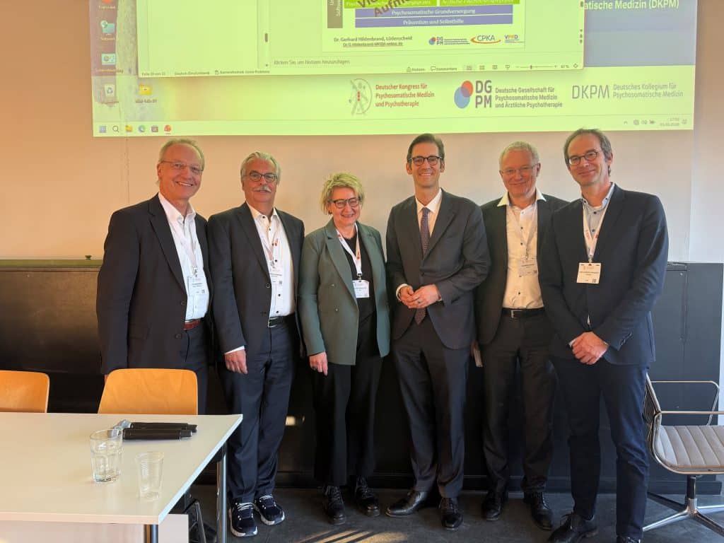 Bild rechts: (v.l.n.r.: Dr. Götz Berberich, Chefarzt, Vorstand Chefarztkonferenz Psychosomatischer Krankenhäuser und Abteilungen e.V. (CPKA),Dr. Gerhard Hildenbrand, Sprecher der Krankenhauskommission der Deutschen Gesellschaft für Psychosomatische Medizin und Psychotherapie e. V. (DGPM), Dr. Ulrike Schultheis, Chefärztin, 1. Vorsitzende des CPKA, Dr. Stephan Pilsinger, Prof. Dr. Johannes Kruse, Chefarzt, Ehrenvorsitzender der DGPM, Prof. Dr. Hans-Christoph Friederich, Chefarzt, Vorsitzender der DGPM); Die Bilder wurden von DGPM zur Verfügung gestellt.